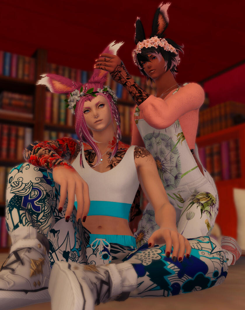 Okhi and Kanyo met each other in Kugane as Okhi was on his way to one of his dance routines. As Okhi was always one to travel, they bumped into each other in the markets. Despite having just met, the pink bun caught the eye of the Prince very quickly. As the night went on, Kanyo happened to catch wind of Okhi's performance and attended. Simply by the performance put out, Kanyo swiftly felt strong feelings for Okhi. Kanyo hurriedly met with Okhi after the performance, wanting to eagerly get to know the Prince. He obliged and the more they spent time with each other, the more Okhi found himself falling in love with the pink bun. Since that night, Kanyo often traveled with Okhi to his performances. On a date in the Black Shroud one night, Kanyo made it clear what he wanted, and that was Okhi. Okhi felt the same strongly towards the pink bun and agreed. Thus creating a strong relationship.